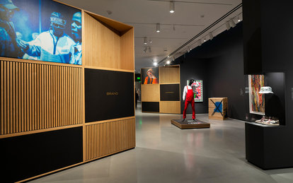 The design for the exhibition borrows from a hip hop concept album as a metaphor for its spatial organization. Six themes—Language, Brand, Adornment, Tribute, Ascension and Pose—form the body of the exhibition and are meant to be experienced sequentially. Modular interpretive casework units function as transitional interludes in the way that skits have been used to transition between songs in many classic hip hop albums. Each interpretive moment is a new set point that reorients the visitor to new thematic content and a new spatial direction.