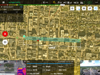 The final flight path for the Huron streetscape project measured approximately 1,650-feet long and required four parallel passes to effectively generate a thermal 3D model. I preset the flight path and altitude to safely travel about 50-feet higher than the tallest structure in the immediate corridor, which equated to an altitude of 200-feet above ground level (AGL). The UAV would travel at a slow crawl of 2mph and capture more than 400 overlapping hi-res thermal images.