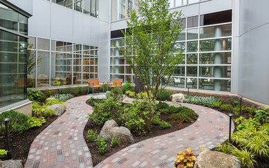 This Hospital Cancer Center expansion project serves patients undergoing some of the most strenuous cancer treatments. Nestled within two existing hospital buildings and a series of landscaped courtyards, the design for this new construction building, which includes an 8,000 sf Oncology Infusion Suite, holistically leverages the healing power of Nature.