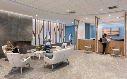 The patient registration and waiting area is designed with a living room-like feel with a focal point fireplace and wood feature wall and unites what was previously two separate departments—Radiation Oncology and Medical Oncology—into one cohesive space. An interior material palette of wood, creams and blues continues the soothing connection to nature.