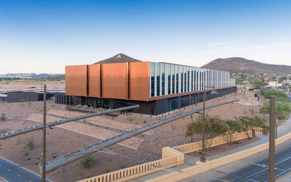 A 150,000 square foot mining center for a global industrial manufacturer in Tucson, Arizona responds to its desert site with massing and materials redolent of the city’s agrarian and mining roots.