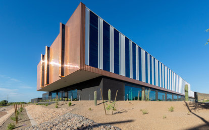 This response to geographical context continues with facades that are appropriate for the Sonoran Desert climate. To the north, the building harvests daylight and views while its facades provide protection from the harshest exposures to the east, west and south. The facades are machine-like in appearance, appropriate for a global industrial manufacturer. Reflecting the mining history of Tucson, a copper “shroud” wraps around the building.