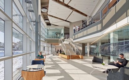 Because the work can be stressful and intense, the building prioritizes employee well-being. The atrium brings natural light deep into interior spaces, and ample reflective materials create bright work areas free of glare. A mixture of open collaborative zones, lounge areas, closed meeting rooms, standing desks and bench seating provide myriad options for both interactive and individual work. A large central stair, with sculptural detailing and warm wood accents, provides another informal gathering area.