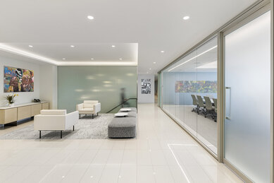 The renovation excelled at problem solving, making efficient use of the budget and the reduced space. Rather than replacing the central stair, lacquered handrails and granite treads gave it a fitting new look. The design team artfully balanced the partners' desires for both privacy and natural light by incorporating large sidelights at each office, creating a harmonious and cost-effective compromise. When a planned translucent ceiling treatment proved unfeasible because of insufficient plenum space, the design and engineering teams conceived a thin LED faux skylight to unify the reception area and bathe it in soft light. Textured glass accents, new lighting and other interior updates all contribute to an engaging and effective work environment for the post-pandemic era.