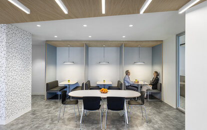 The design relocates an interior café to a prime location along a curved exterior wall, where it takes advantage of plentiful sunlight and striking western views, including abutting the glass where people can plug-in and work while enjoying those views. It establishes a social center, with an array of booths and tables that provide options for dining, meeting and impromptu connections. An enlarged reception area leads to a large conference room, which was doubled in size. The reception area and conference room can function as one large event space or be separated with a glass partition specified for its sound-reduction properties, and with a configurable table system to also accommodate event uses.