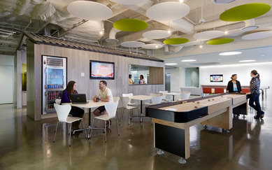 Swapping private-office environments for neighborhoods proved practical and created an environment for collaborative teamwork. Pops of color. Flares of texture. Spaces that allow for quick exchanges, in-depth brainstorming sessions, even late-night snacks.