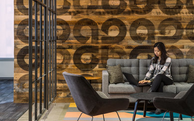 以一种生动有趣的手法,将Ally金融的徽标印在回收木材表面,这个图案在整个建筑中反复出现。